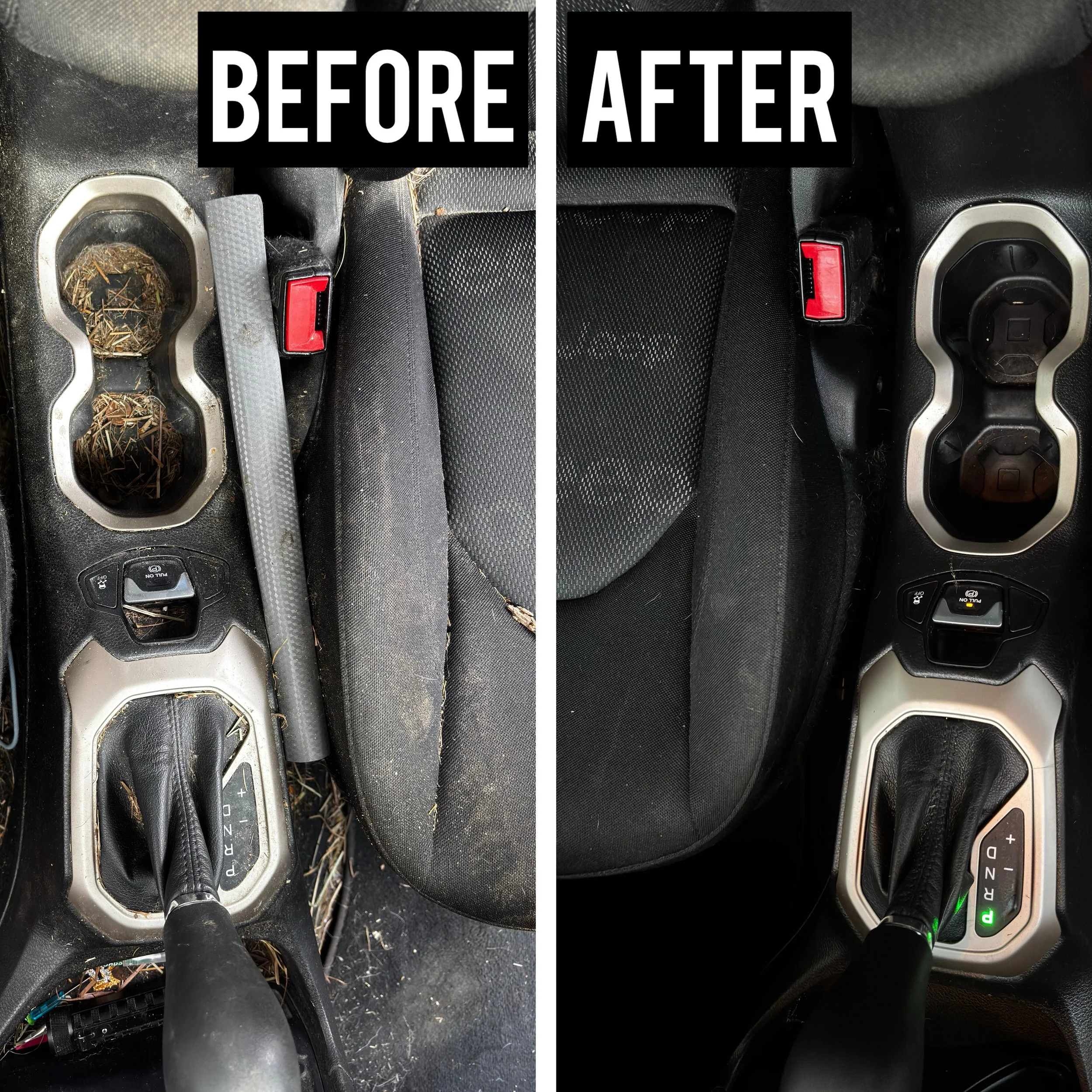 Interior: Vinyl protective sealant, carpet and fabric stain resistance protection, light stain removal, light pet hair/straw removal, and car scent refresh.